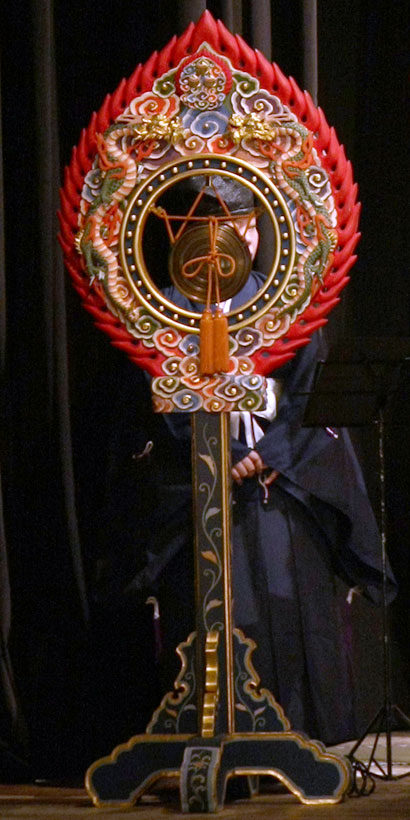 Dish-shaped bronze gong. The shôko is struck on the inside rim with 2 wooden sticks held in both hands. We use Oosyôko in bugaku.