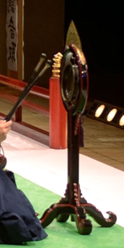 Drum with a skin head about 60 cm in diameter. The taiko is suspended from frame which is adorned with a flame design and beaten with sticks held in both hands. The sticks are made of wood and wrapped in leather. In bugaku, a larger drum about 4 meters high is used. It's called Dadaiko.